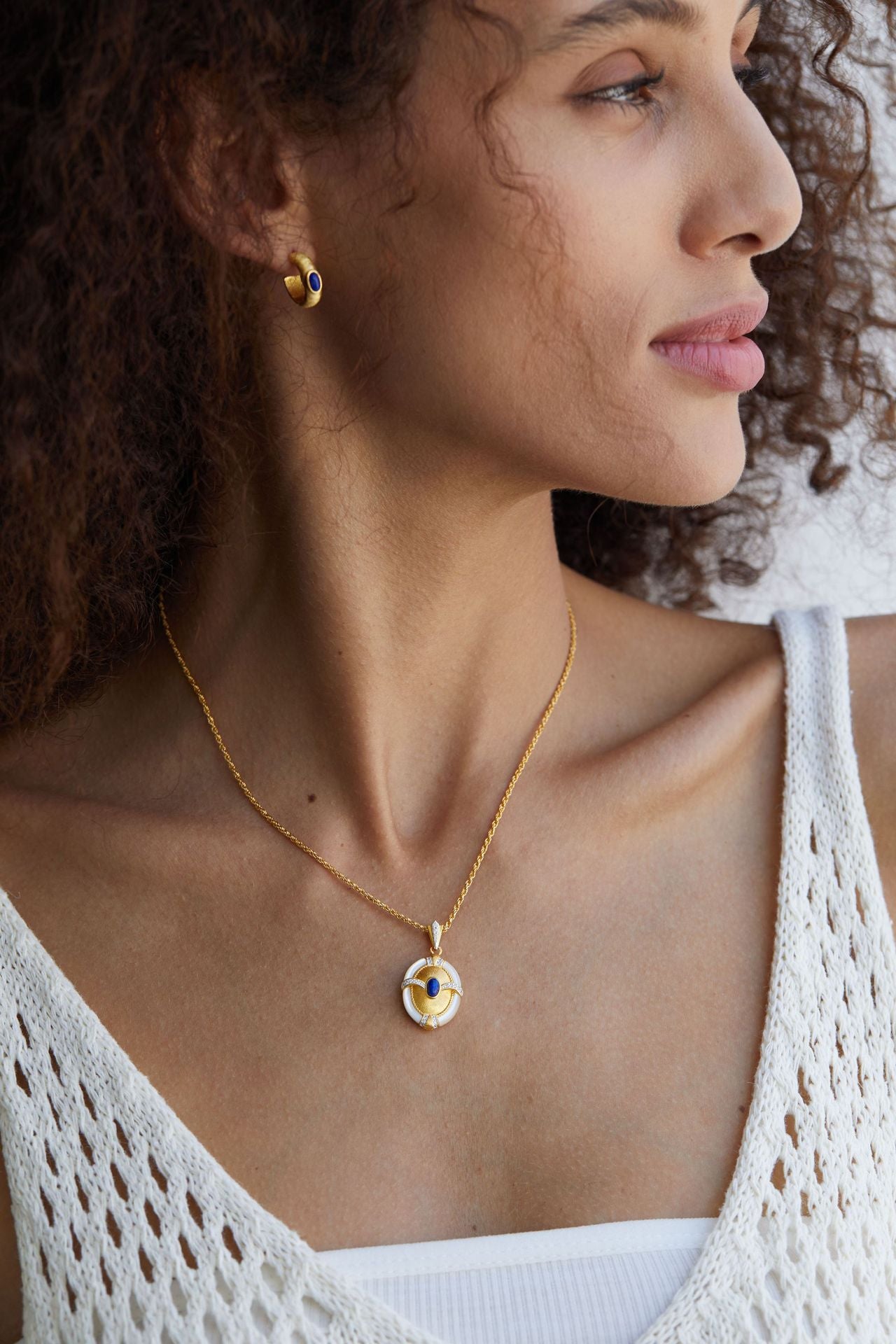 Серебряное колье ручной работы из серебра S925 с матовой отделкой, подвеской из натурального лазурита, плетеной цепочкой, минималистичным дизайном и белым перламутром.